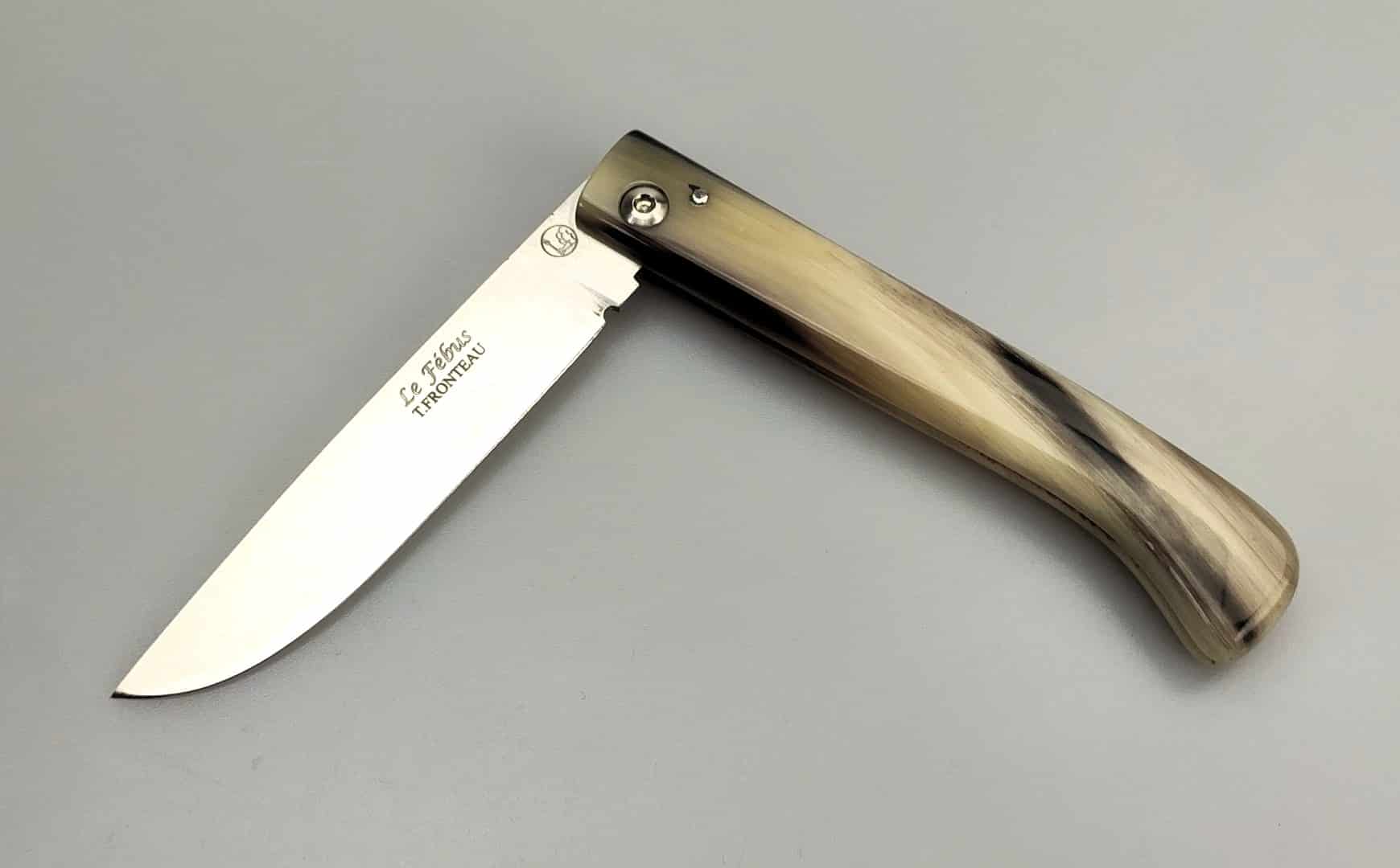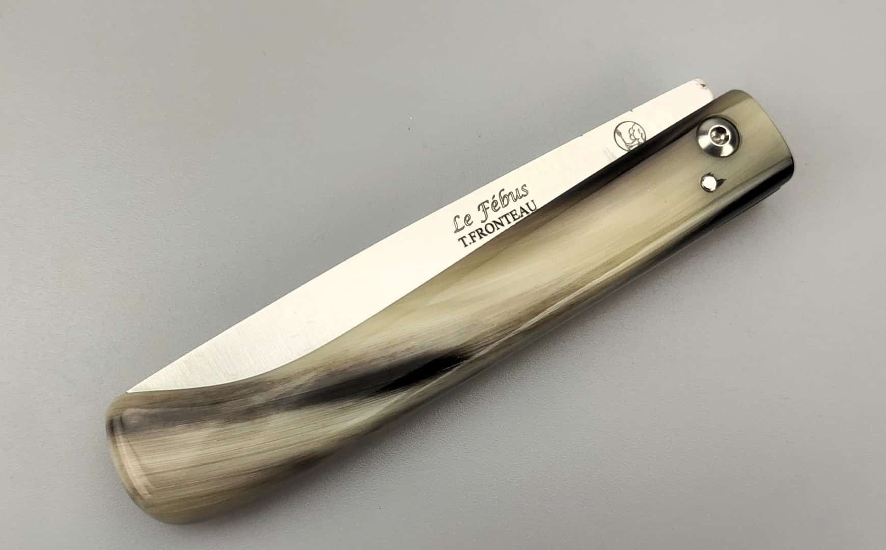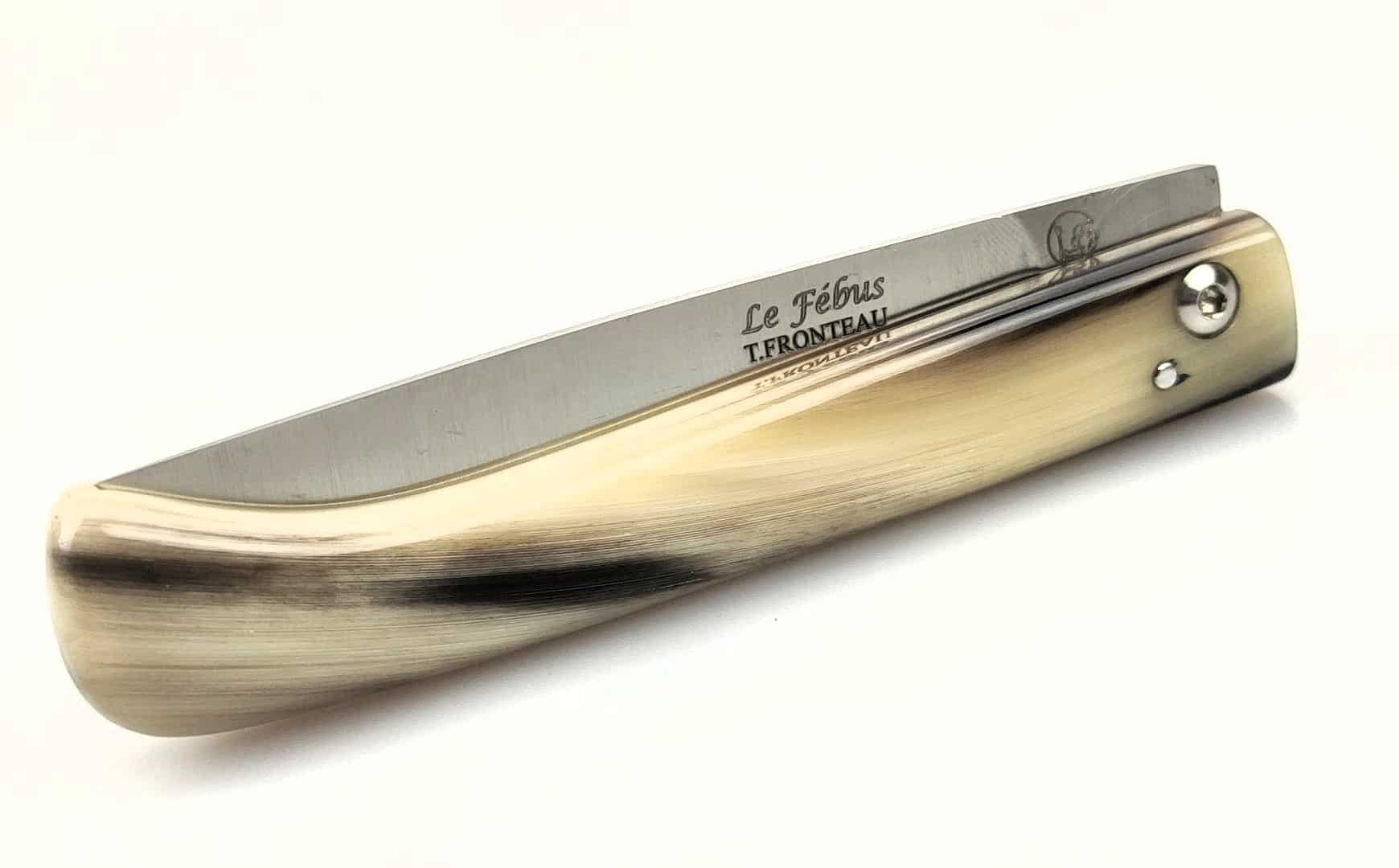 Le Fébus traditionnel corne blonde jaspée 12C27 est un couteau de poche entièrement fabriqué artisanalement par Thomas Fronteau, dans le respect des traditions de la coutellerie.