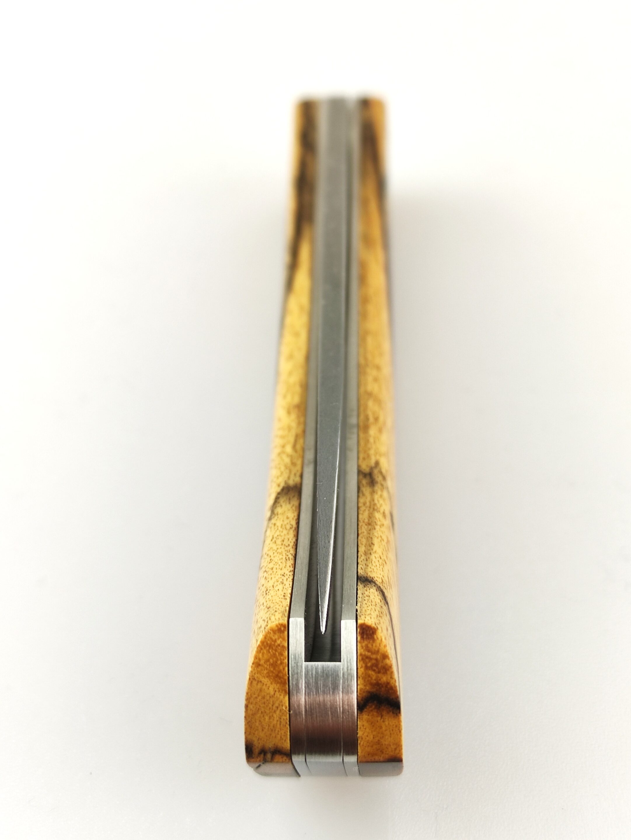 Lame: Acier Damasteel Technologies des poudres qui associe le RWL34 et le PMC27. Acier avec une structuration superficielle vive, la texture a été créée par soudage au feu et pliage des aciers avec des teneurs en carbone différentes, cette acier est un alliage qui combine de manière optimale une grande dureté (longévité de la coupe) à une excellente inoxydabilité.