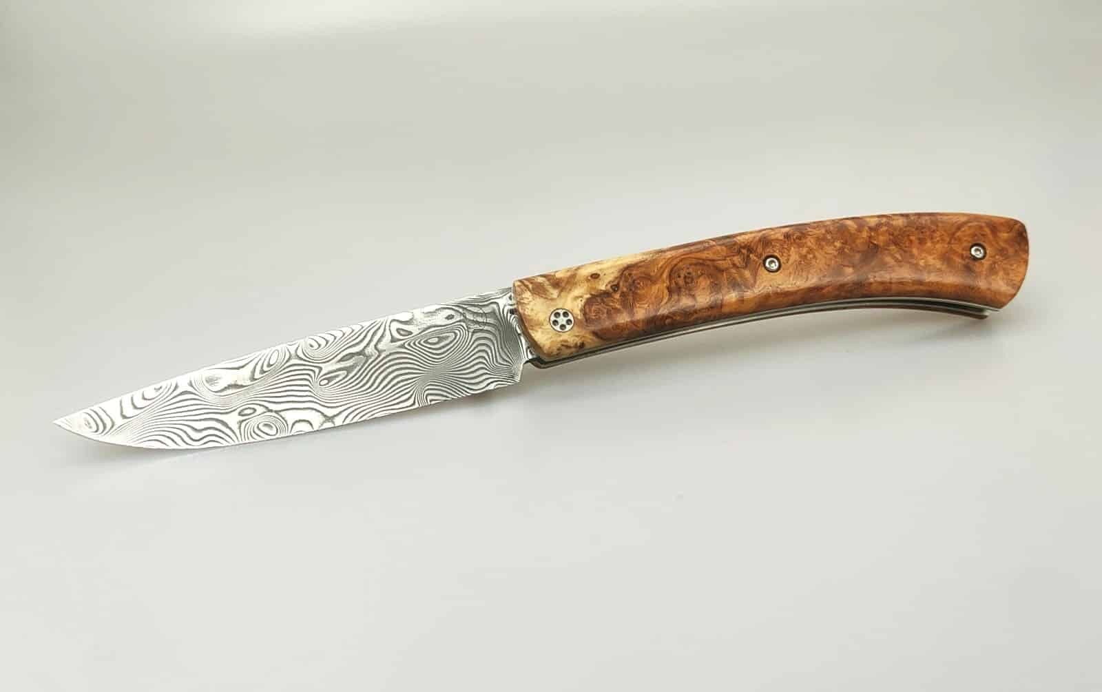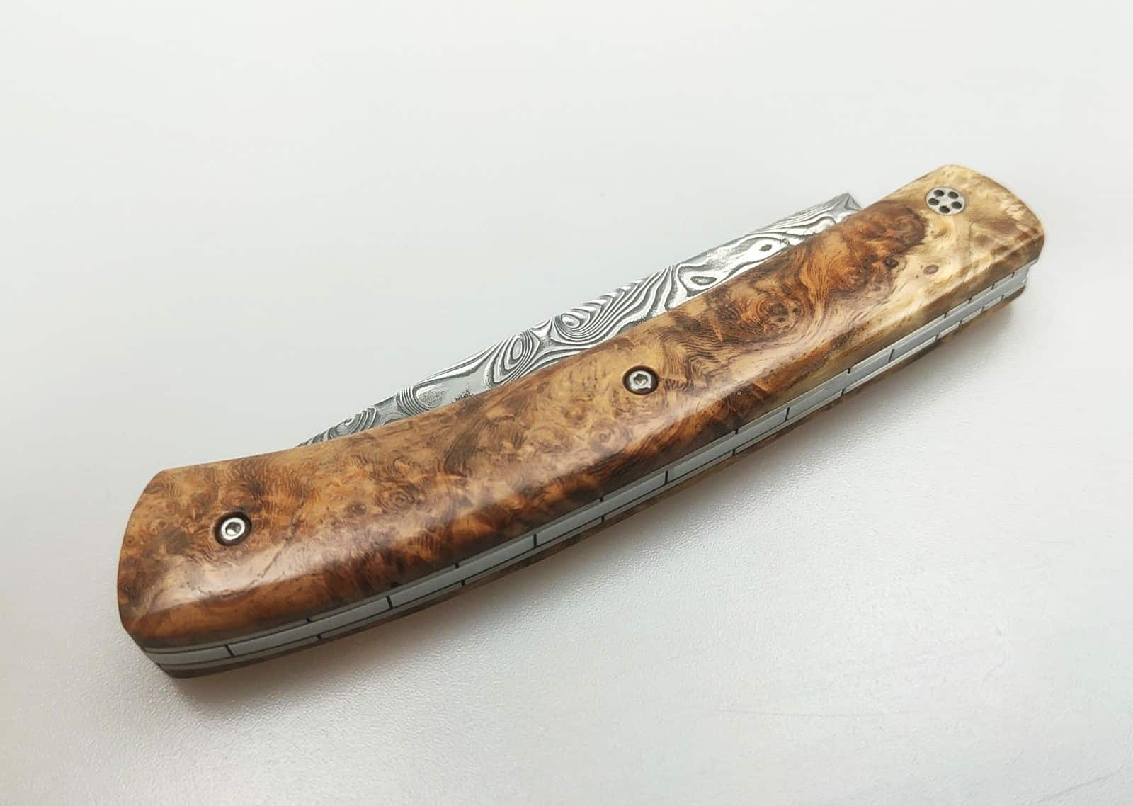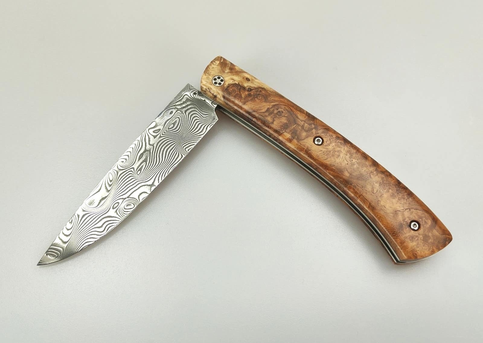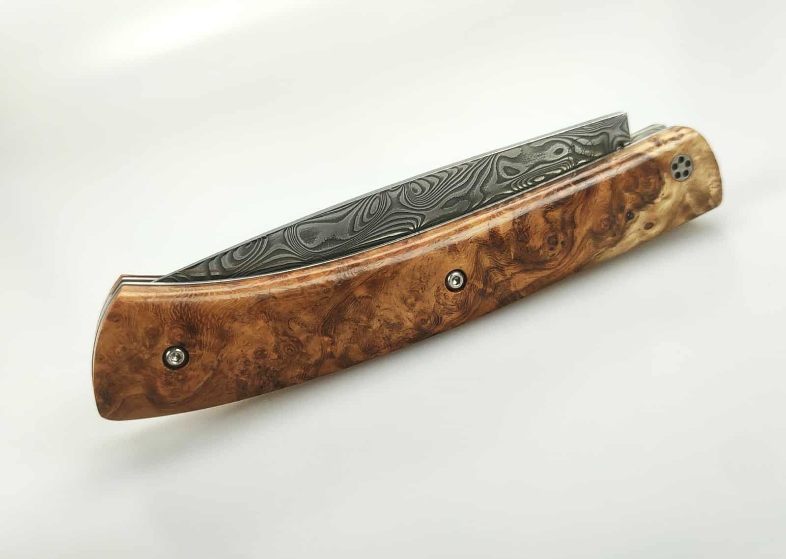 Le Pastelier cran plat Damas inox et loupe d’Amboine rouge stabilisé