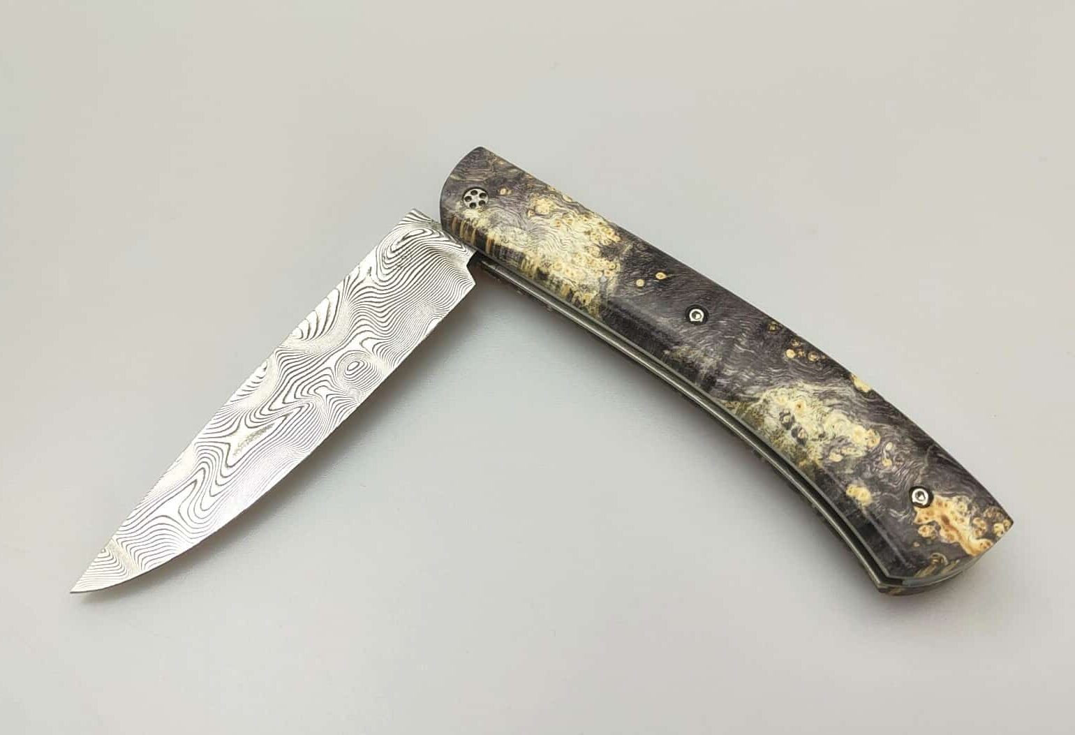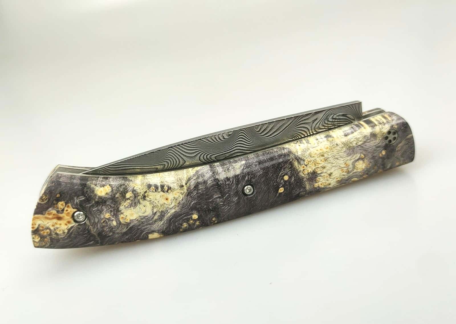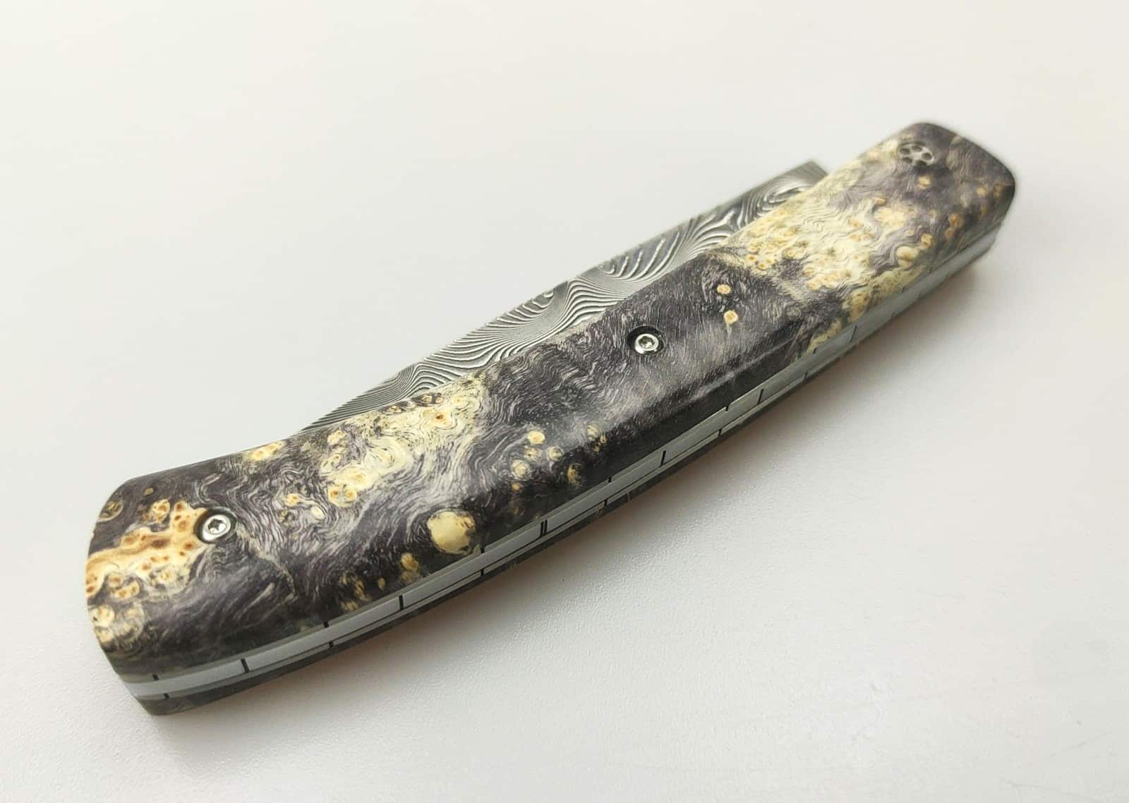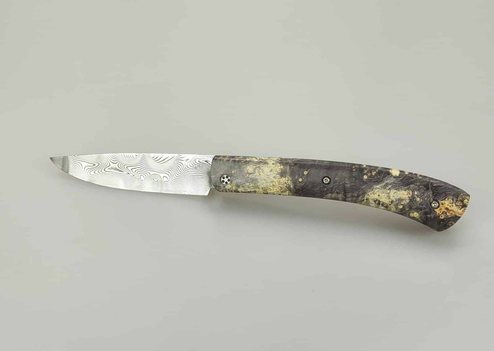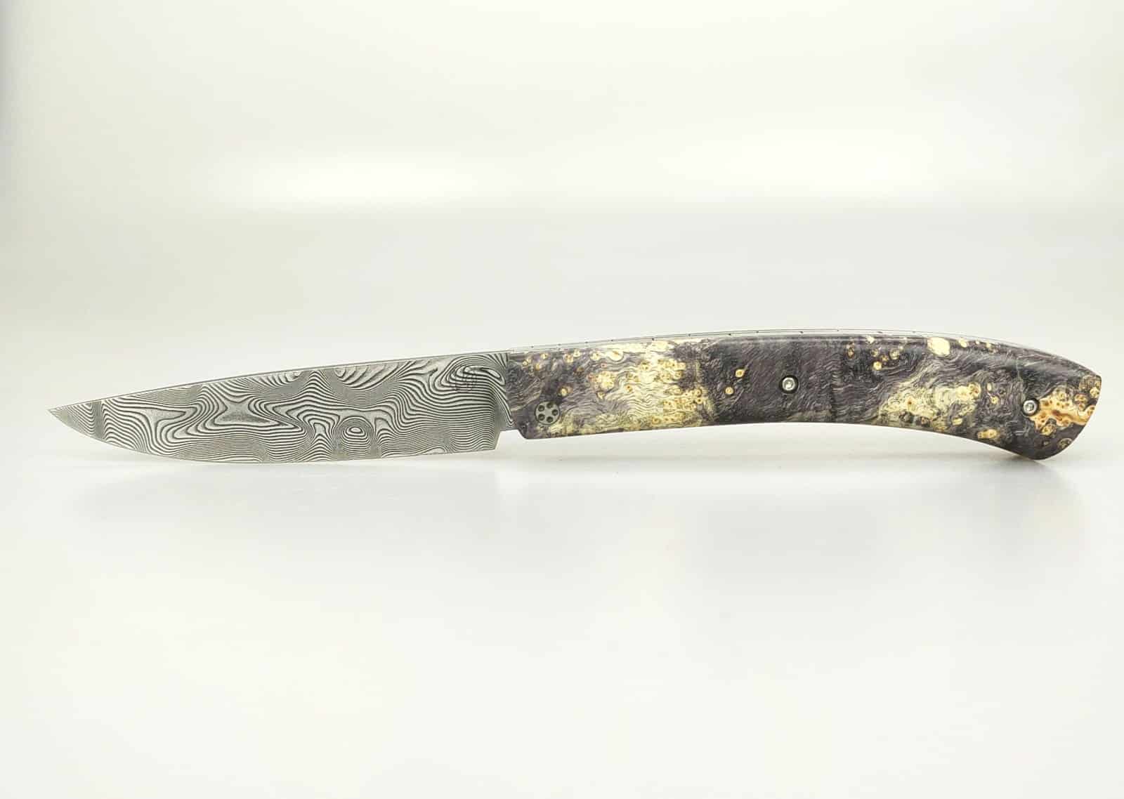 Le Pastelier cran plat damas inox et loupe de peuplier stabilisé