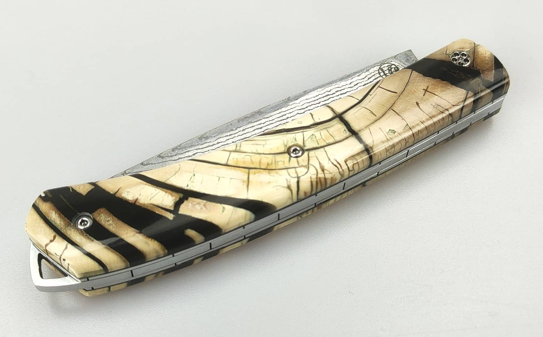 - Tranche d’ivoire de mammouth stabilisé : Un matériau précieux et rare, chargé d’histoire, offrant une texture unique et une beauté fossile inégalée. Ces molaires de mammouth sont des fossiles authentiques datant de plus de 10 000 ans, ce qui leur confère une dimension historique et symbolique unique.