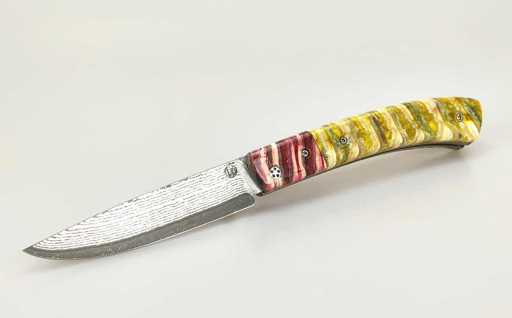 Le Pastelier cran plat Damas Japonais VG10 67 couches, mitres et manche en molaire de mammouth stabilisé