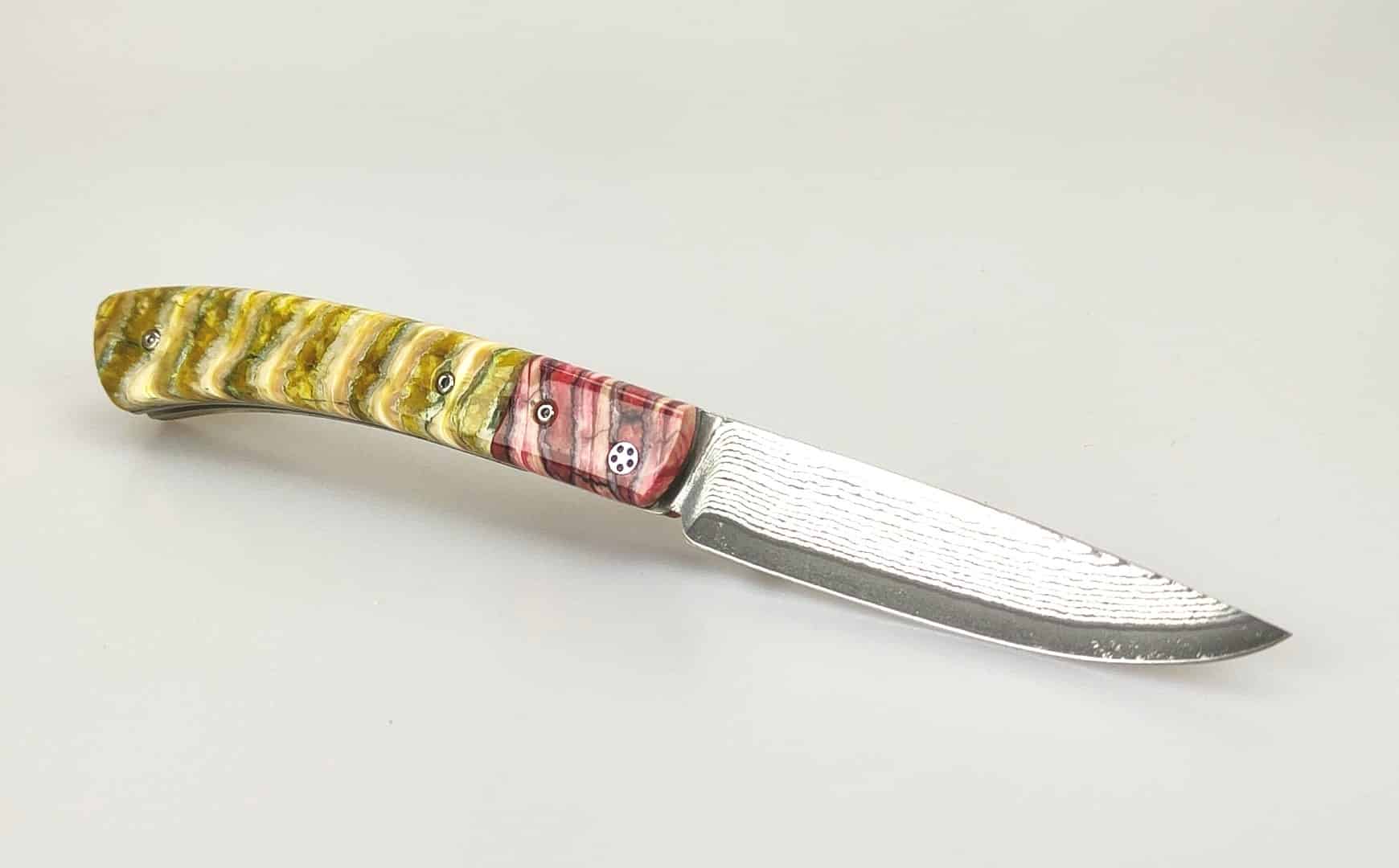 Le Pastelier cran plat Damas cuivre, mitres et manche en molaire de mammouth stabilisé est bien plus qu’un couteau : c’est une pièce d’exception, un objet de collection et un héritage à transmettre. Son design intemporel et ses matériaux prestigieux en font un cadeau d’exception, pour les passionnés de coutellerie ou les amateurs de pièces uniques.