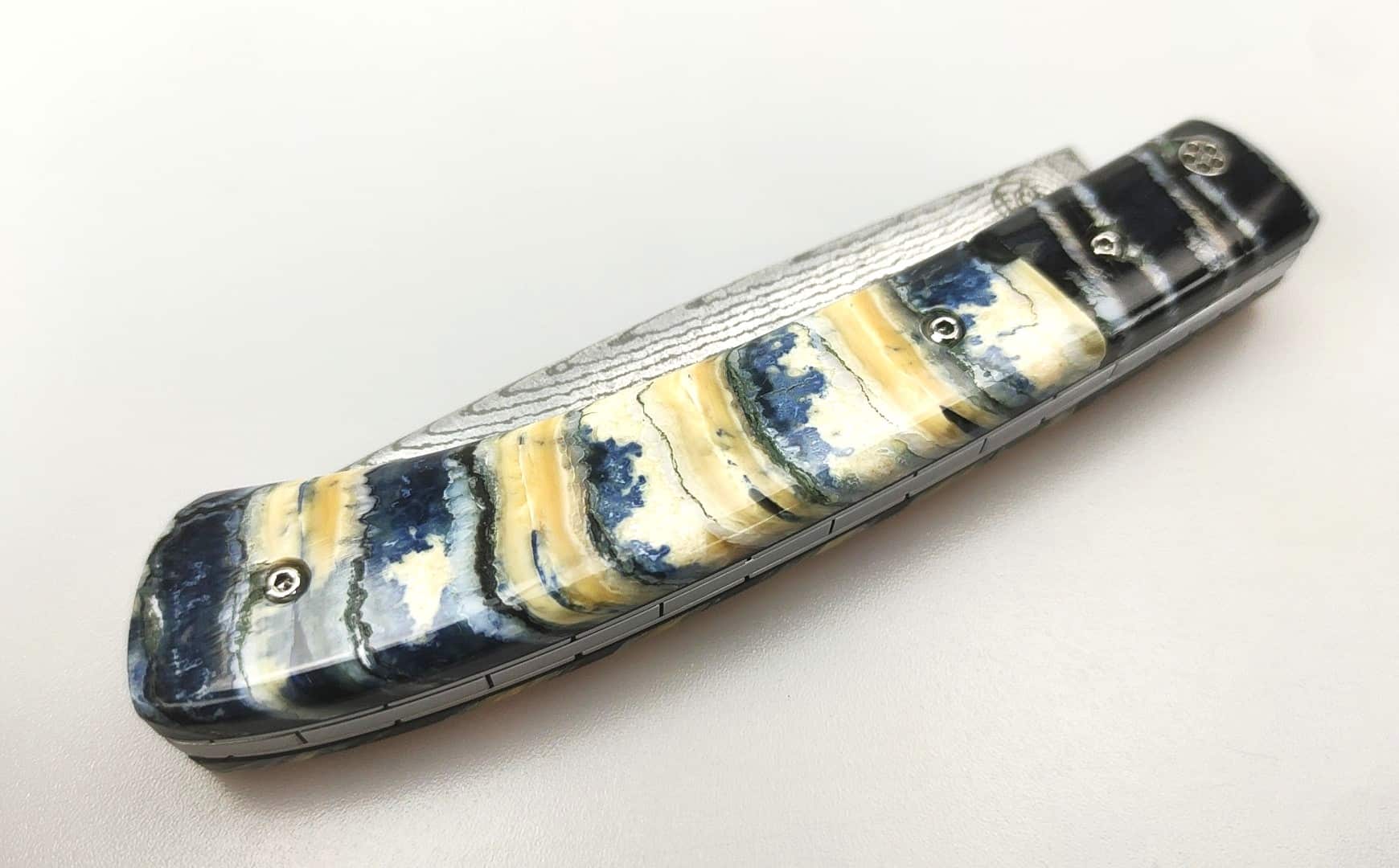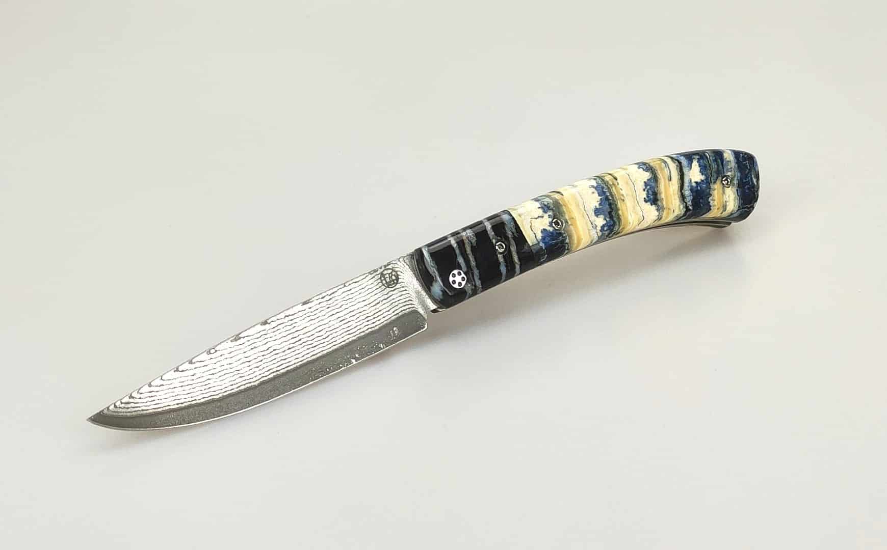 Le Pastelier cran plat Damas Japonais VG10 67 couches, mitres et manche en Molaire de mammouth stabilisé
