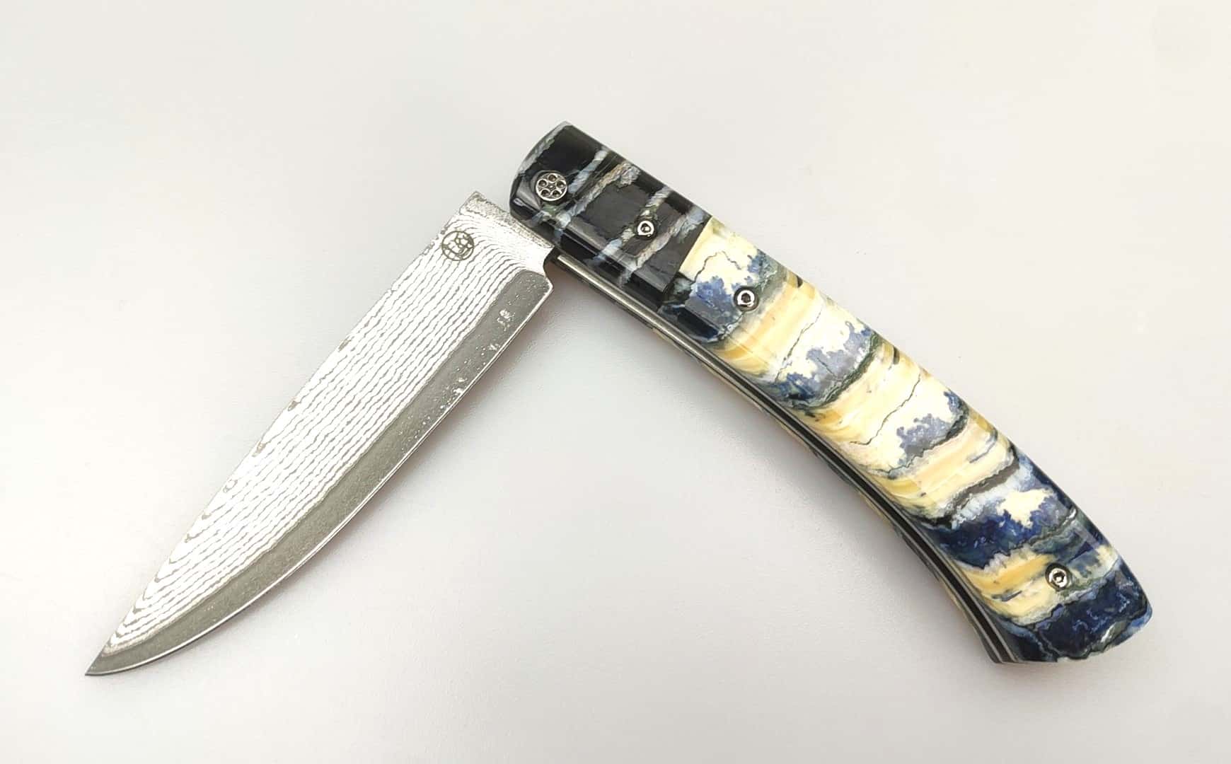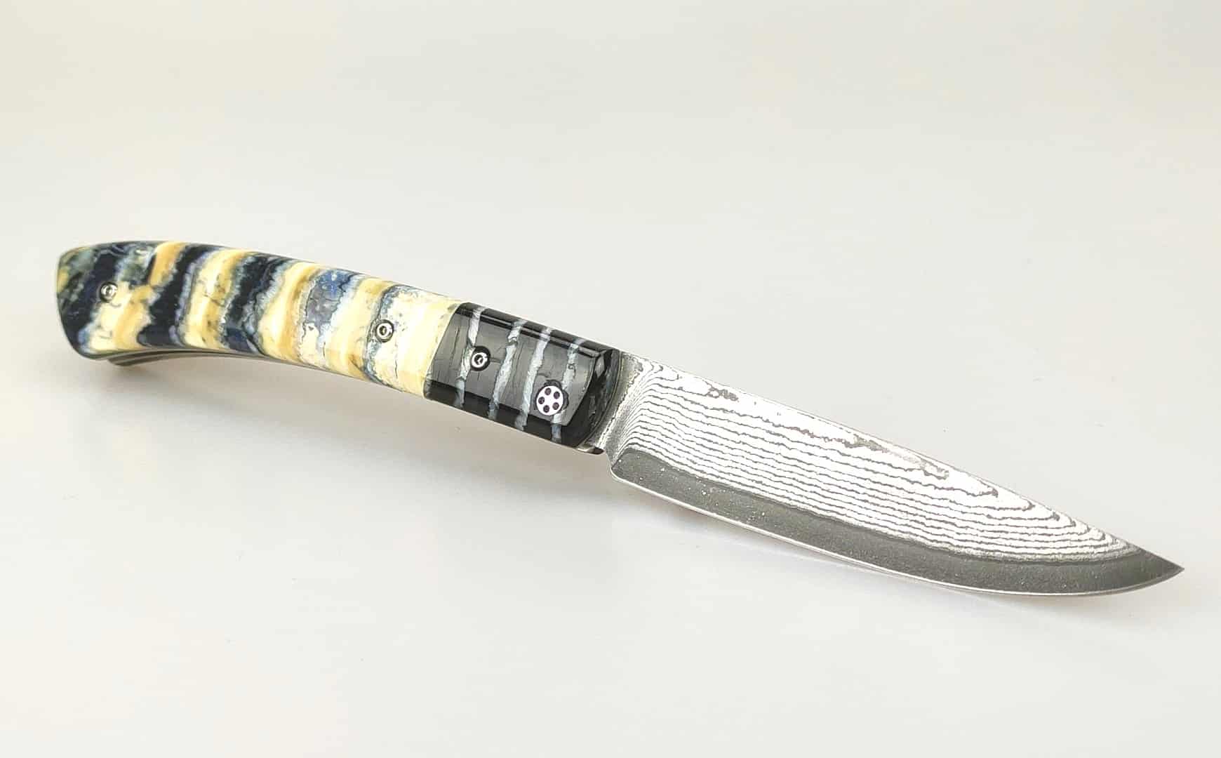 Le Pastelier cran plat Damas Japonais VG10 67 couches, mitres et manche en molaire de mammouth stabilisé